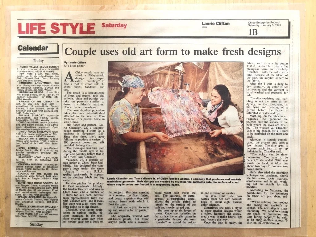 We are Laurie and Thom Vallance, and we've been marbling (off-and-on) since the early 1990s. Laurie's mom (Mara) inspired us with a book on water marbling, and since then we have created many amazing designs and products. Around 1990, we started our business, Asutra, along with our friend Eric. Since then, we have evolved into BeMarblous!